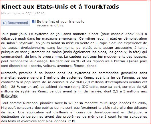 Kinect in La Libre : “Kinect aux Etats-Unis et à Tour & Taxis”