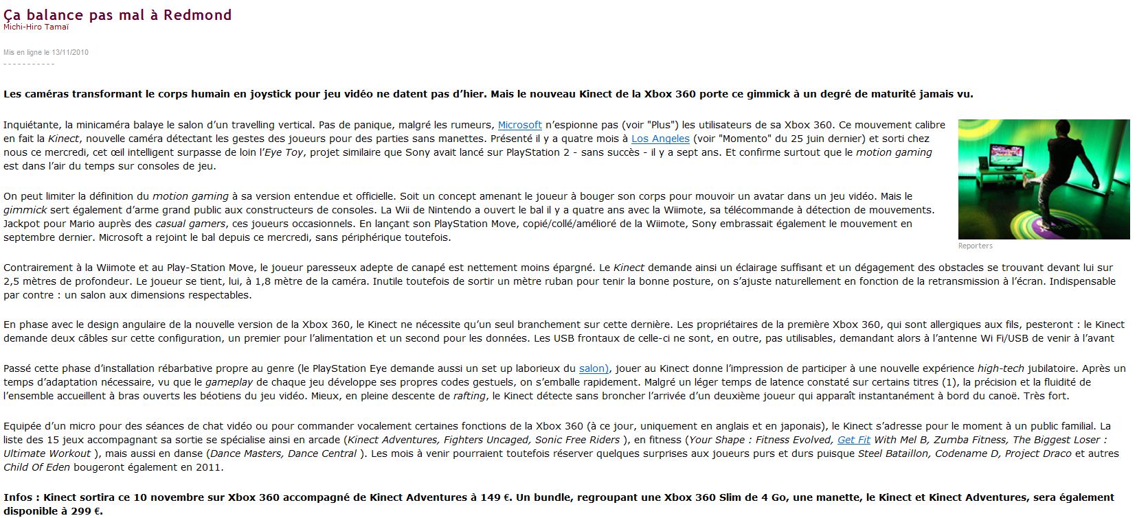 Kinect in La Libre : “Ca balance pas mal à Redmond” (Michi-Hiro Tamaï)