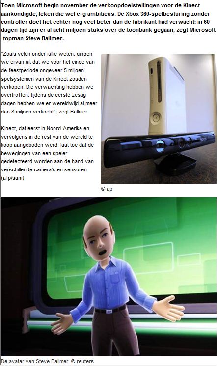 #Kinect in “#De Morgen” : “#Microsoft overtreft ambitieuze verwachtingen: al 8 miljoen Kinects deur uit”