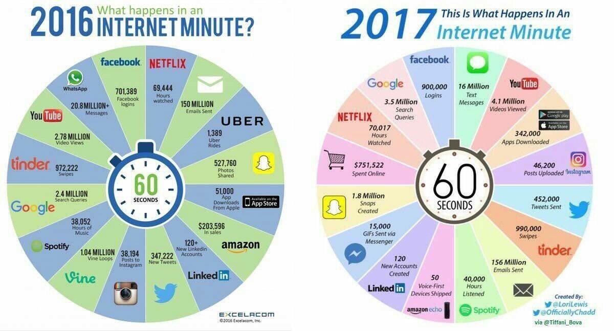 What happens in 1 minute on internet in 2017 vs. 2016 ?