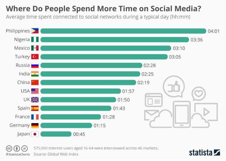 - Nigeria, Mexico, and Turkey all typically spent over three hours a day on social media sites.