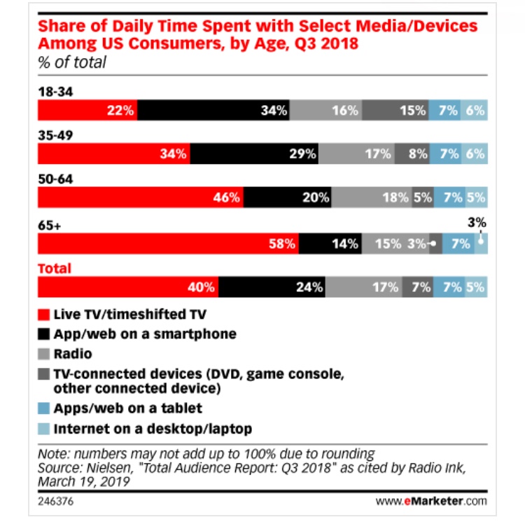 - According to Q3 2018 research from Nielsen, US consumers ages 35 to 49 spend nearly the same amount of time with old media like live and timeshifted TV and radio, as with their digital devices by accessing apps and the web on a smartphones or tablet.