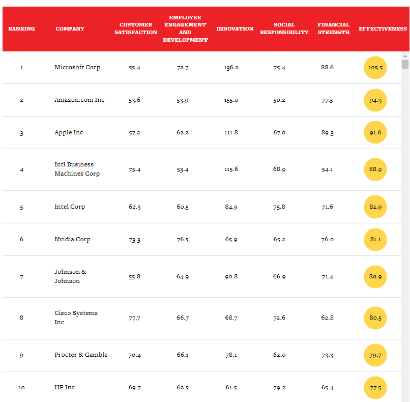 Those weights were as follows: Customer Satisfaction = 19%; Employee Engagement and Development = 19%; Innovation = 23%; Social Responsibility = 25%; and Financial Strength = 14%.