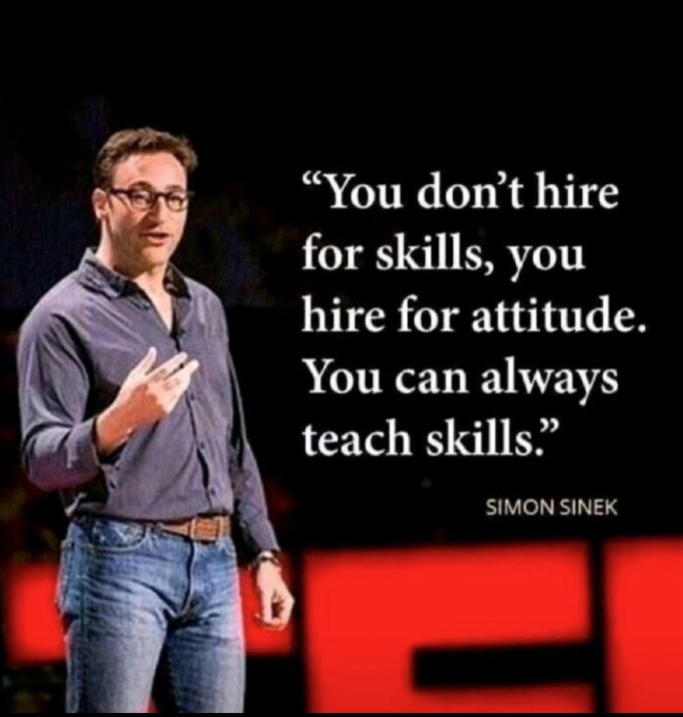 Simon Sinek’s succinct wisdom—“You don’t hire for skills; you hire for attitude. You can always teach skills.”—holds profound implications. Let’s dissect this notion further.