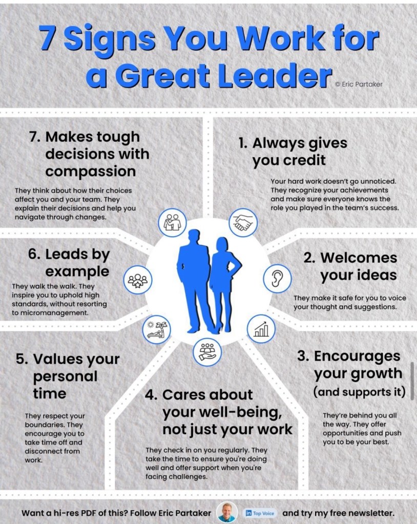 Imagine a workplace where exceptional leadership isn’t just a buzzword—it’s a palpable force that shapes the culture, drives success, and inspires everyone to reach their full potential. In this blog post, we’ll explore the seven unmistakable signs that you’re fortunate enough to work under an extraordinary leader. Buckle up; this journey promises insights, anecdotes, and actionable takeaways. Thanks Eric Partaker for this great visual.