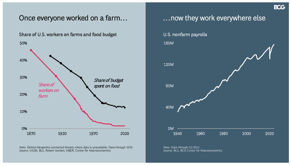 The graph below from BCG, illustrates the dramatic shift in the U.S. workforce from agriculture to other sectors over the past two centuries. The left graph shows a steep decline in the share of workers on farms and the portion of the food budget spent on farm products. Conversely, the right graph highlights a significant rise in nonfarm payrolls, reflecting the diversification of the U.S. economy.