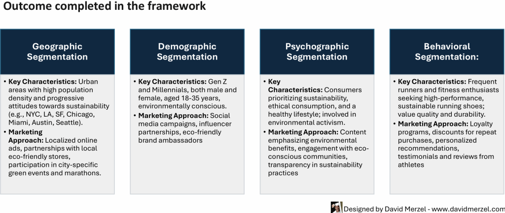 “Segment the market for running shoes market based on geographic, demographic, psychographic, and behavioral factors. For each segment, provide key characteristics and potential marketing approaches. Guidance: Be brief and concise in the outcome so that I can capture all the information in a one pager template”