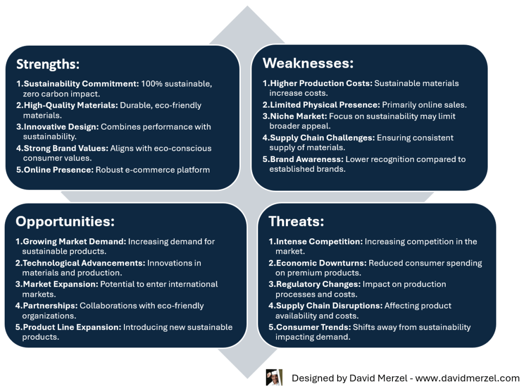 “Conduct a SWOT analysis for X Brand Sustainable running shoes in the Running shoes market. Identify 3-5 key points for each category: Strengths, Weaknesses, Opportunities, and Threats. Provide brief explanations for each point. Make the content crisper and concise so that it can be put on a SWOT one pager.”