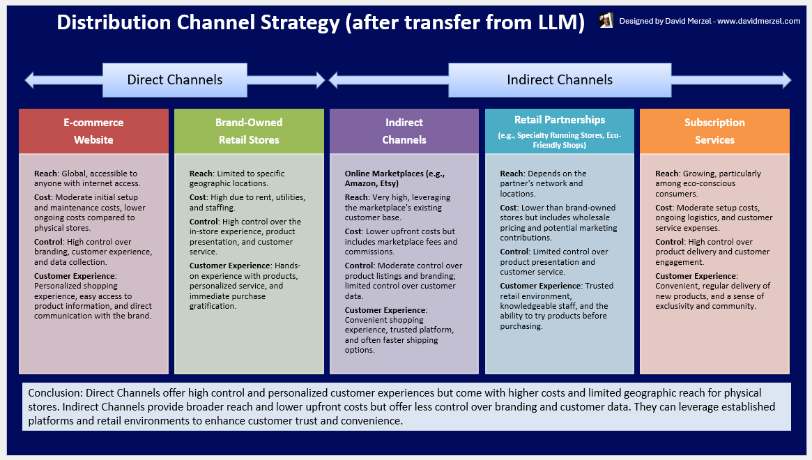 “Develop a Distribution Channel Strategy for a sustainable running shoes brand. Include both direct and indirect channels. For each channel, evaluate its reach, cost, control, and customer experience aspects. Focus on maximizing efficiency and customer satisfaction.”