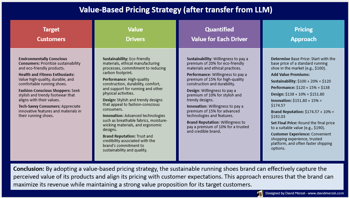 “Develop a value-based pricing strategy for a sustainable running shoes brand. Identify target customers, determine value drivers, quantify the value for each driver, and suggest a pricing approach. Include considerations for consumer surplus and competitive positioning.”
