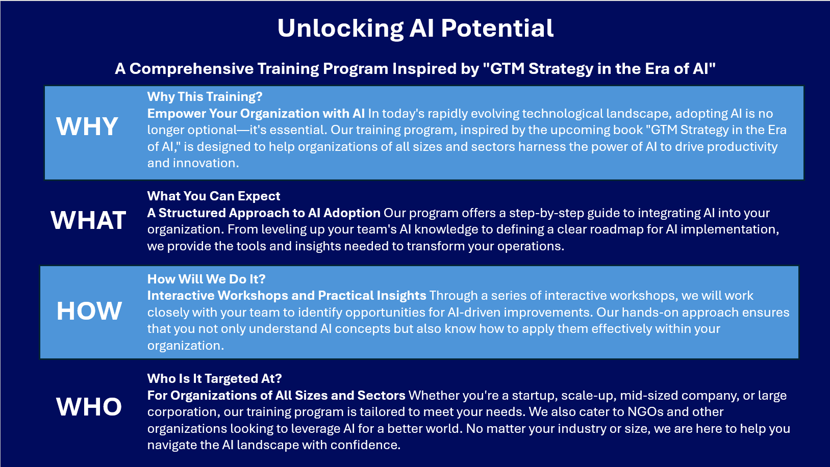 For organizations looking to stay competitive and innovative, our groundbreaking training program, inspired by my upcoming book “GTM Strategy in the Era of AI,” is designed to transform how your team approaches Go-To-Market (GTM) strategies through the power of AI.