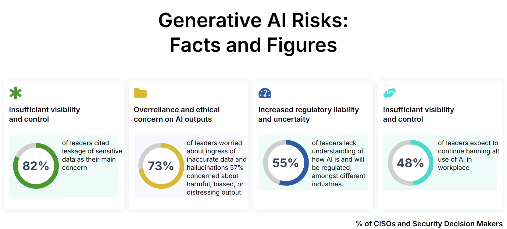 Generative AI poses significant risks, including data leakage, inaccurate and harmful outputs, and regulatory uncertainties. Leaders must address these concerns to ensure ethical and secure AI implementation.