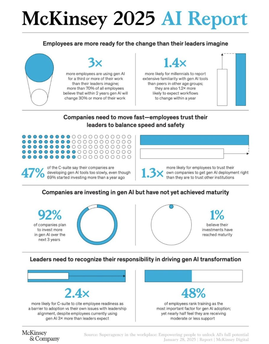 I’ve been wrestling with the implications of AI for a while now, especially as it relates to go-to-market strategies. In my book, training programs, and webcast series, the AI revolution is a recurring theme. It’s not just about the tech. It’s about how we, as humans, adapt. It’s also about how we lead and ultimately thrive in this new landscape. But a recent McKinsey report on AI for 2025 threw a curveball that made me rethink everything. It highlights a fascinating paradox: employees seem to be embracing AI faster than their leaders realize.