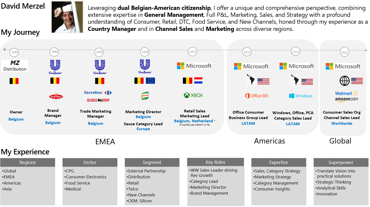 - I wanted to challenge myself even more. So I decided to join Microsoft. It is a company at the forefront of innovation and digital transformation. At Microsoft, I have had the opportunity to work in different regions. These regions include the Americas and EMEA. I also worked in various segments such as Retail, OEM, Distribution, Mobile Operator and SMB. I led the full P&L and general management of businesses like Microsoft Office, Windows, Xbox, Surface, and PC Accessories. I have also been recognized as a Marketer of the Year Nominee and a Top Sub Award Winner.