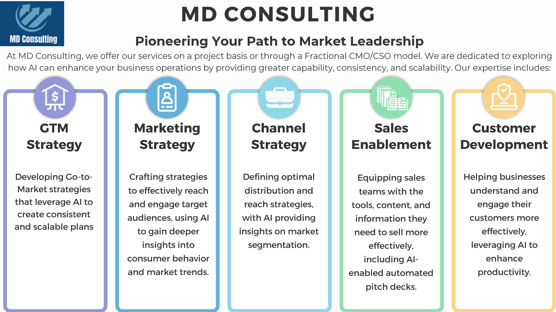 At MD Consulting, we offer comprehensive support from GTM strategy to customer development. Our services are built on five key pillars designed to drive your success